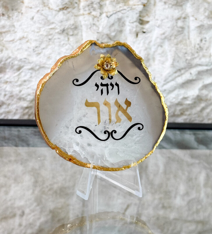 אבן אגת עם מסגרת בציפוי זהב וכיתוב ‘ויהי אור’ עם פרח מוזהב.