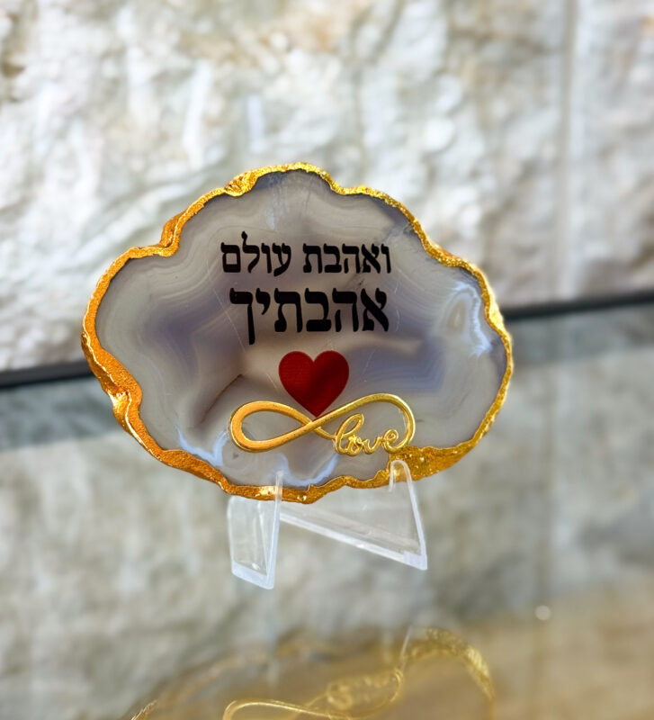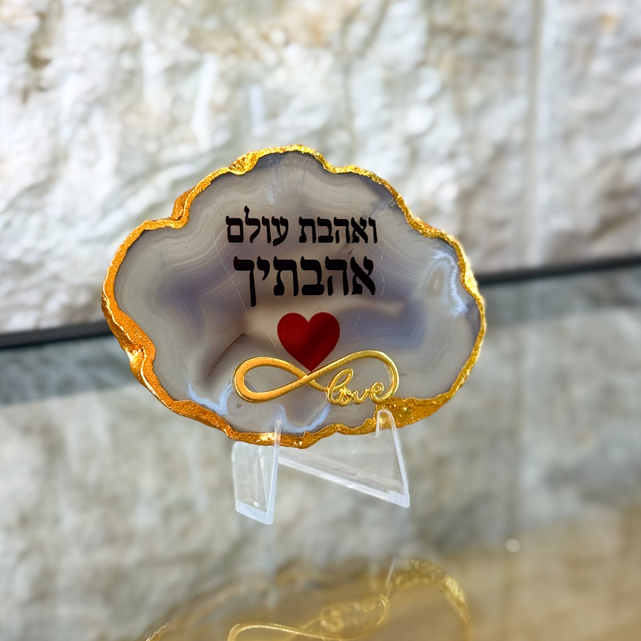 אבן אגת עם מסגרת בציפוי זהב וכיתוב ‘ואהבת עולם אהבתיך’ עם סמל אינסוף מוזהב.
