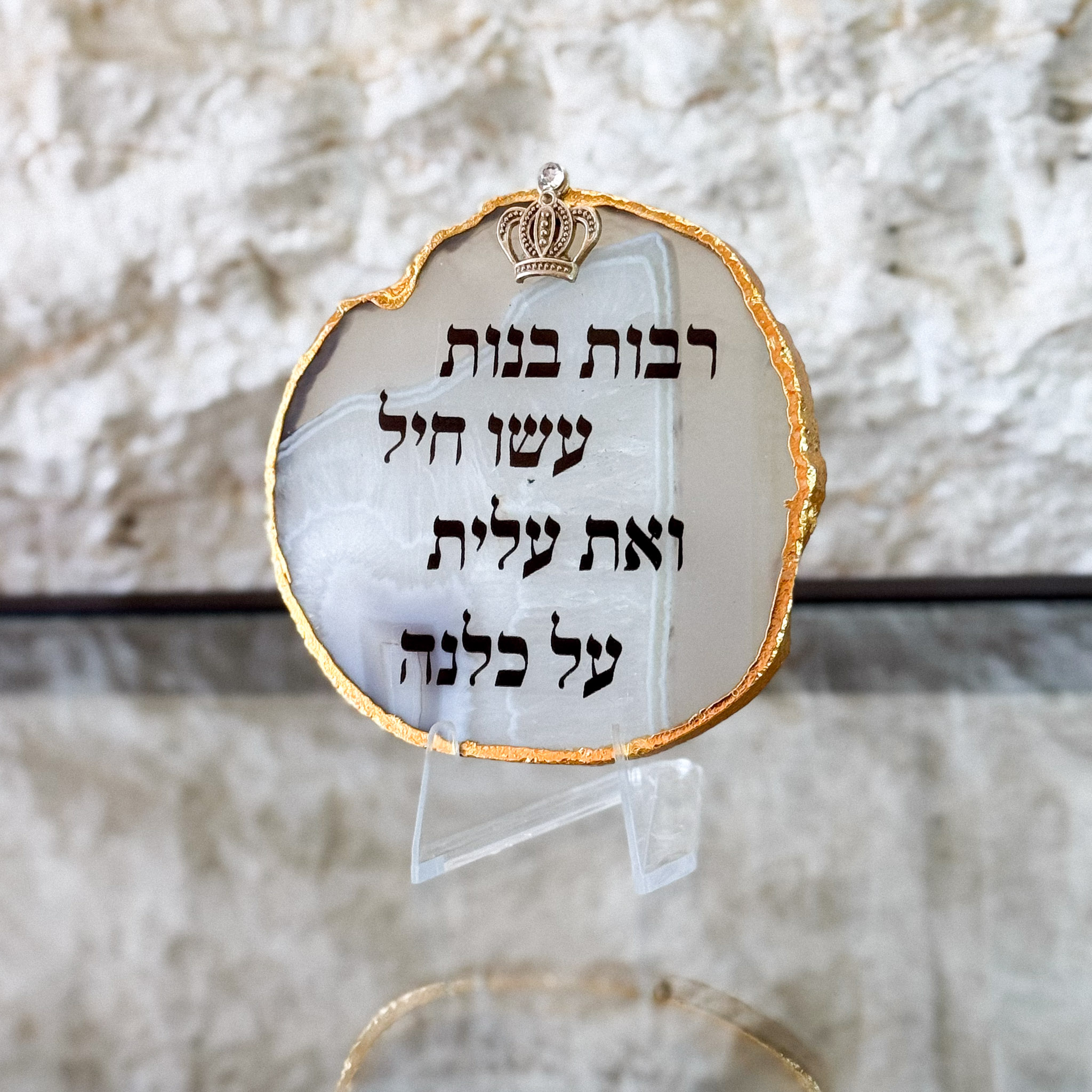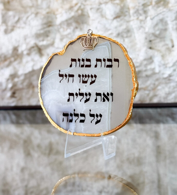 אבן אגת עם מסגרת בציפוי זהב וכיתוב ‘רבות בנות עשו חיל ואת עלית על כולנה’ וכתר מוזהב.