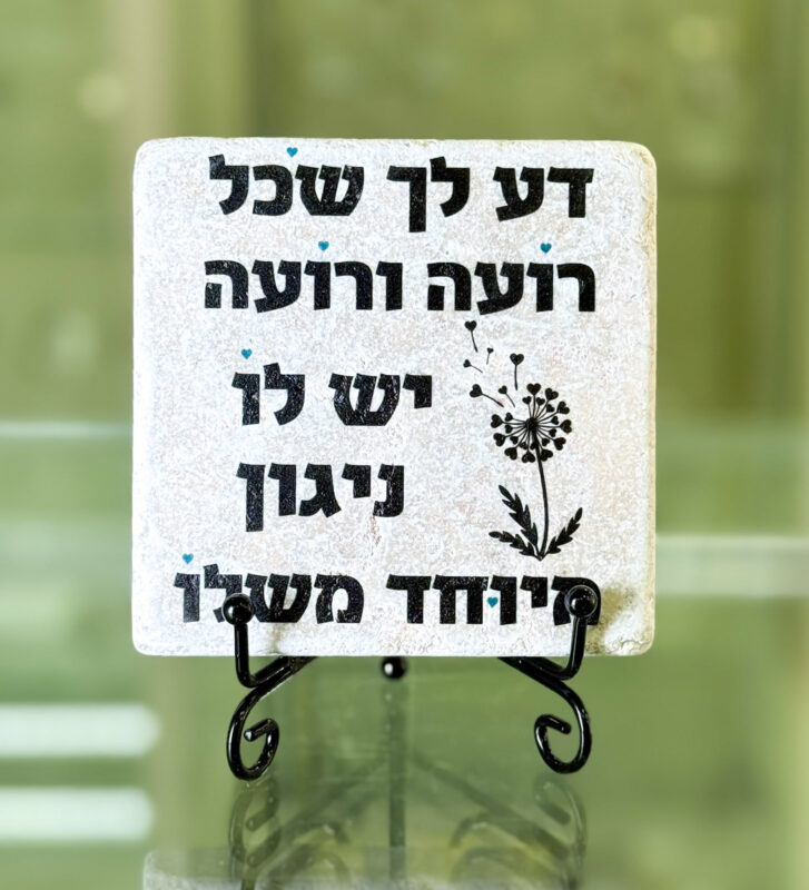 אריח מאבן ירושלים עם כיתוב ‘דע לך שכל רועה ורועה יש לו ניגון מיוחד משלו’ (שירת העשבים) בגודל 10 על 10 ס”מ.