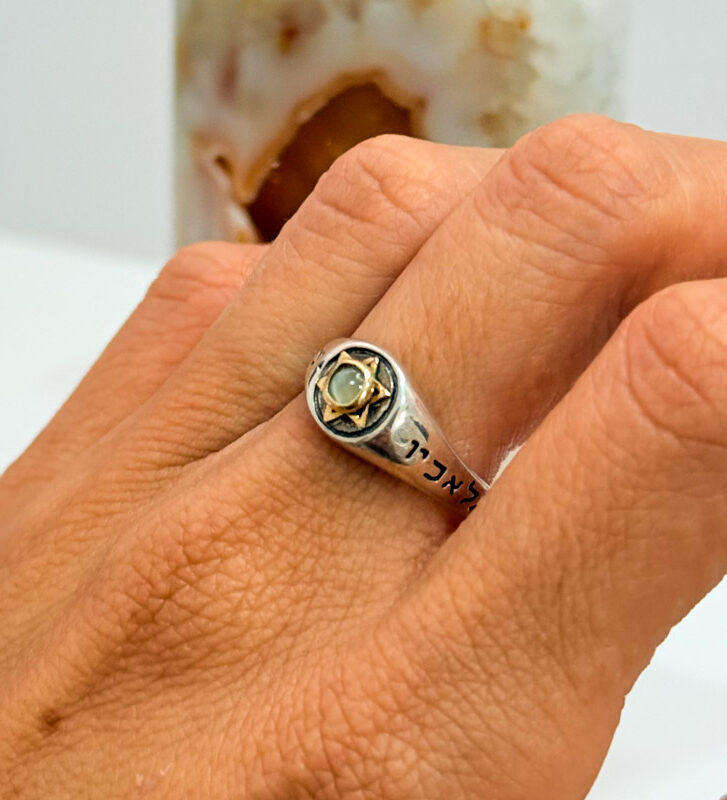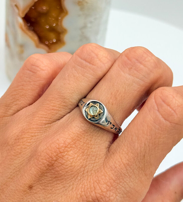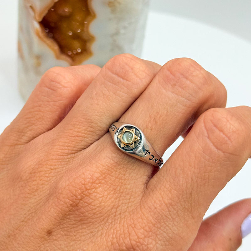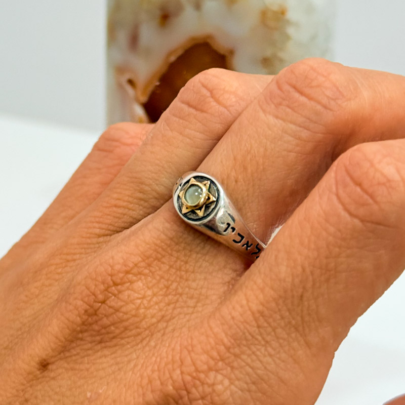 טבעת משולבת כסף 925 וזהב עם עיצוב מגן דוד משובצת אבן קריסובריל וברכה ‘כי מלאכיו יצווה לך’.