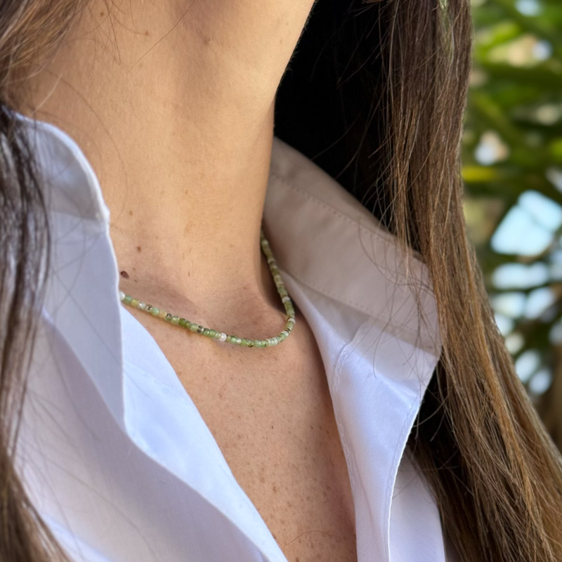 מחרוזת עדינה מאבני גרנט ירוק, בעיצוב נקי וקלאסי.