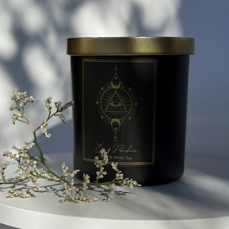 נר בעיצוב מינימליסטי אך עוצמתי, עם סמל עין הפרובידנס- העין הרואה הכול, המסמלת הגנה, בהירות רוחנית וחיבור לאינטואיציה.