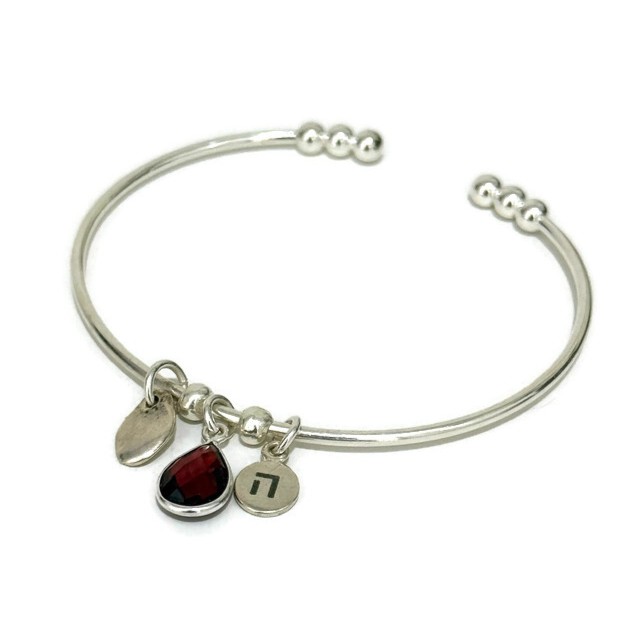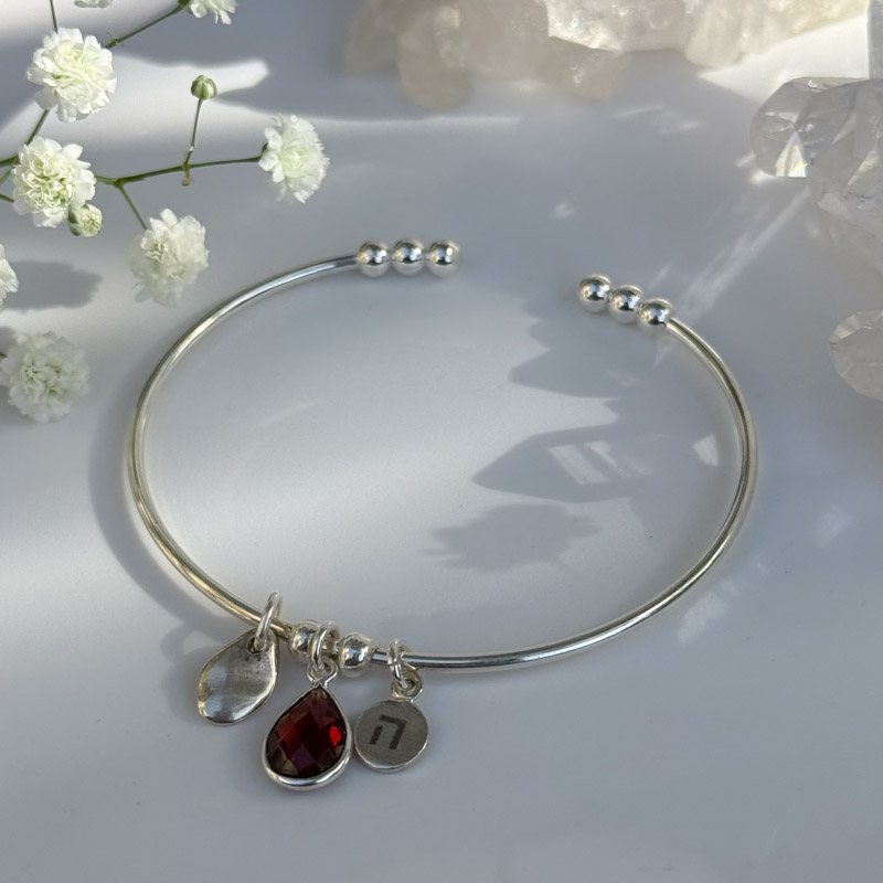 צמיד כסף קשיח בעיצוב נקי ואלגנטי, המשולב בטיפה מאבן גרנט, טיפת כסף וצ׳ארם עם הצירוף “כלי”, אחד מצירופי שמות הבורא, המזוהה עם אנרגיות של פריון ושפע.