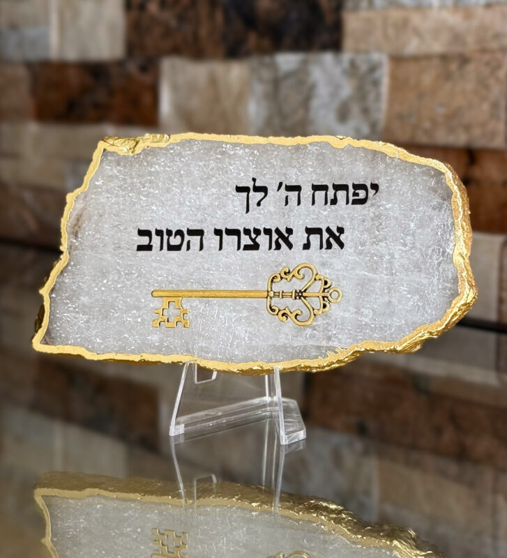 אבן קוורץ עם מסגרת מוזהבת וכיתוב ‘יפתח ה’ לך את אוצרו הטוב’ עם מפתח מוזהב.
