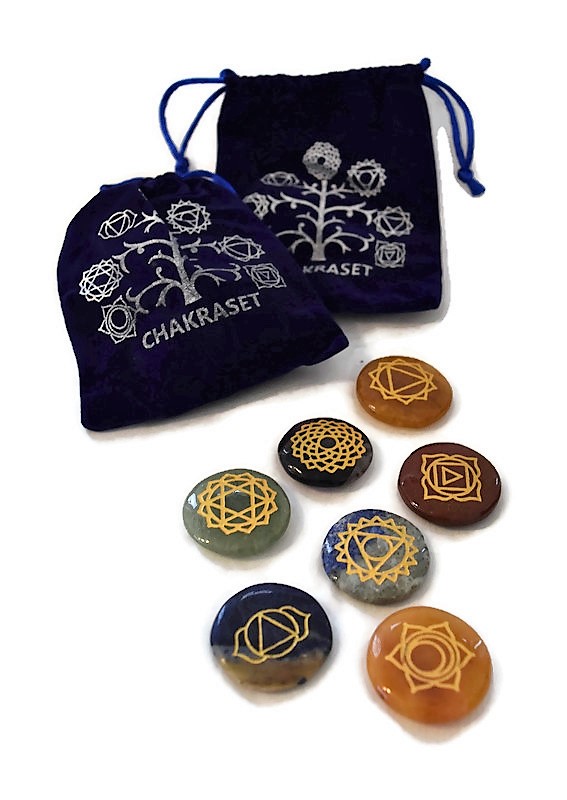 A set of polished stones with a chakra symbol etched on the bottom of each, corresponding to the stone and color of each chakra. Excellent product for personal work as well as healing and therapy.