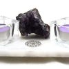 Glass candlesticks upon a stone base combined with yellow calcite and the flower of life.